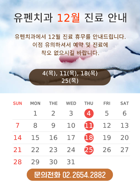 인쇄 스크랩 목록 공지사항 | 2025년 12월 진료일정 안내입니다 페이지 정보 유펜치과 391 0 2025-11-21 06:50:18 본문 안녕하세요~유펜치과 2025년 12월 진료일정 안내드립니다약속시간 착오 없으시길 바랍니다감사합니다 인쇄 스크랩 목록 다음글 ▼2025년 11월 진료일정 안내입니다 댓글목록 등록된 댓글이 없습니다. 다음글 목록
